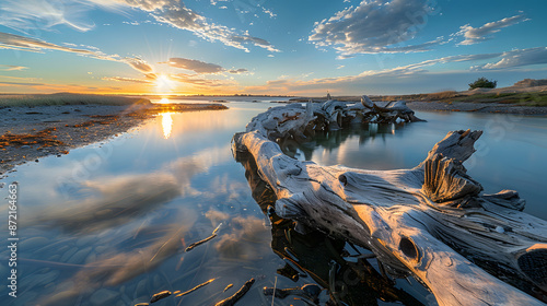 The watermark will not be included on Wall mural.: A large log is floating in the water, with the sun setting in the background