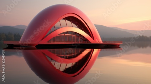 The watermark will not be included on Wall mural.: A large red building sitting on top of a lake - generative ai image -