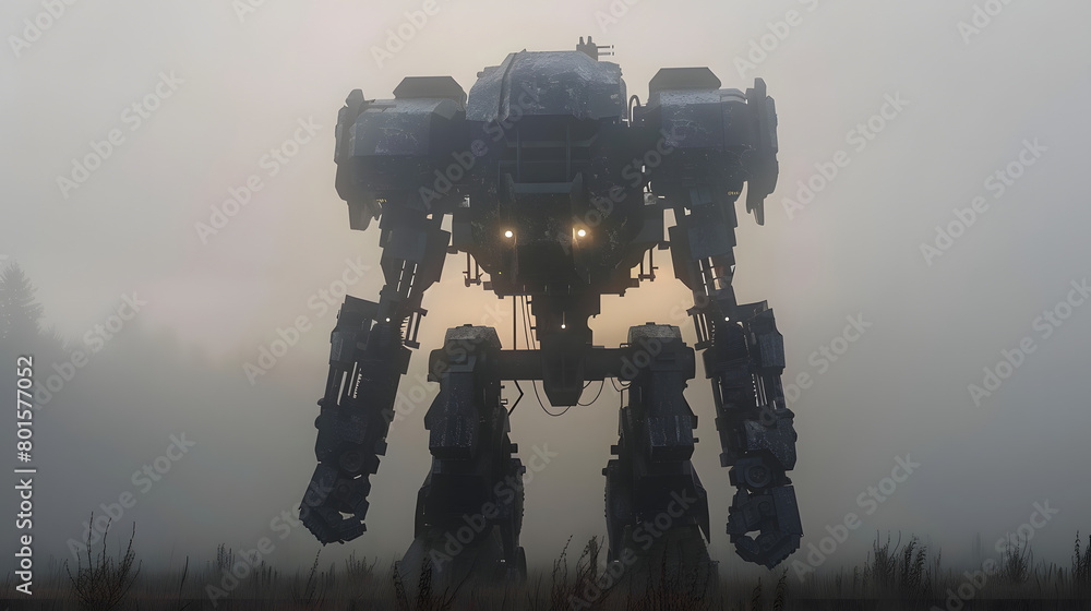 The watermark will not be included on Wall mural.: A large robot standing in the middle of a foggy field