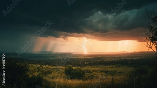 The watermark will not be included on Wall mural.: A large storm is coming in over a grassy field with a tree - generative ai