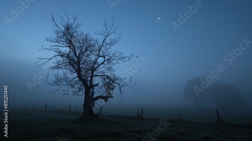 The watermark will not be included on Wall mural.: A large tree with a lot of branches is in a foggy forest