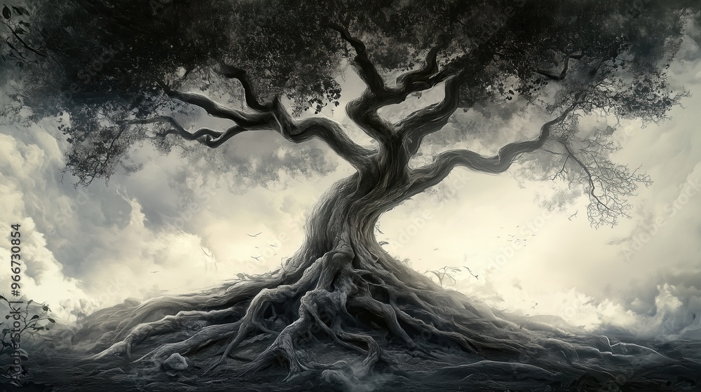 Wall mural a large tree with roots that are spread out and reaching deep into the ground. the image has a mood  - Wall murals Wall mural a large tree with roots that are spread out and reaching deep into the ground. the image has a mood - Wall murals