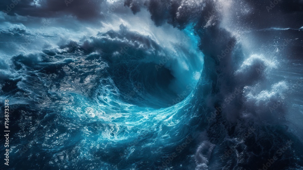 The watermark will not be included on Wall mural.: A large wave in the middle of a body of water with dark clouds in the background and a boat in the m