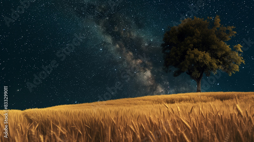 The watermark will not be included on Wall mural.: A large wheat field under the starry sky, with an old tree in the center of it - the grass is golden