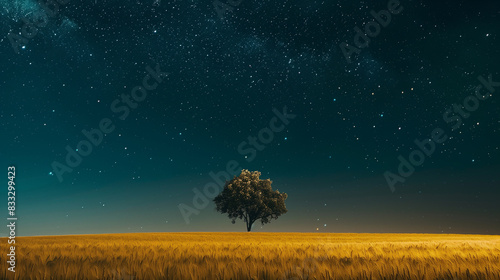 Wall mural a large wheat field under the starry sky, with an old tree in the center of it. the grass is golden