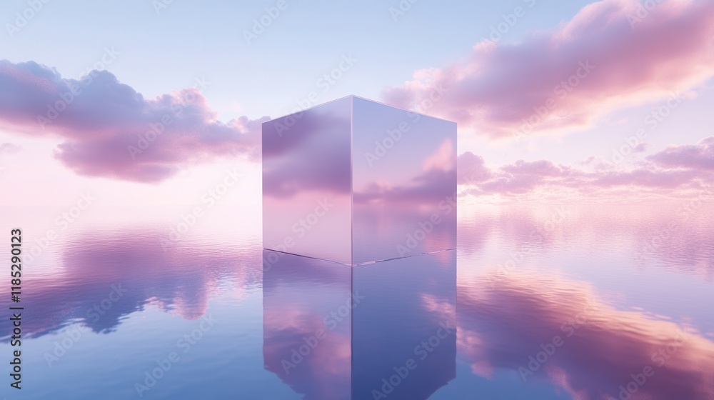 Wall mural a large white square cube mirror floating highly in the middle of an endless cloudy sky. the perspec
