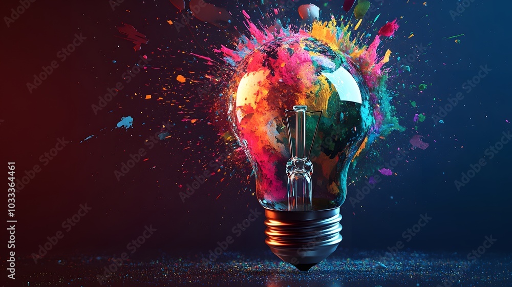 The watermark will not be included on Wall mural.: A light bulb exploding with colorful paint splatter