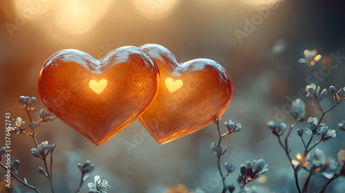 The watermark will not be included on Wall mural.: A light gradient background with glowing intertwined hearts, small floral patterns and minimal abstr