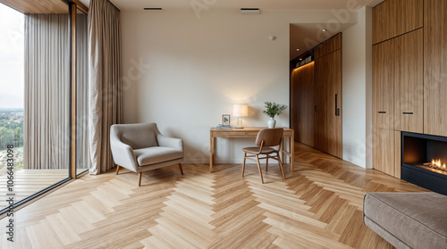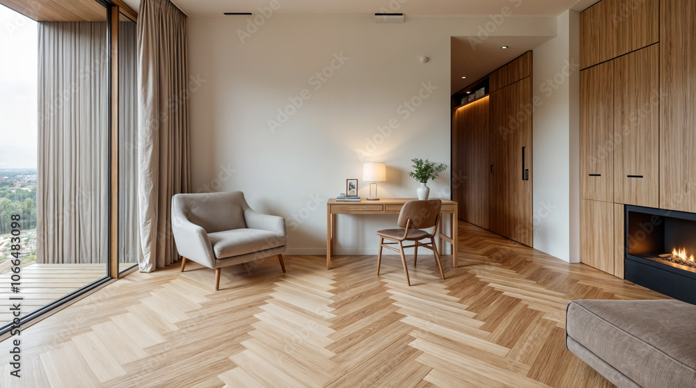 Wall mural a living room with a fireplace and a chair - Wall murals Wall mural a living room with a fireplace and a chair - Wall murals