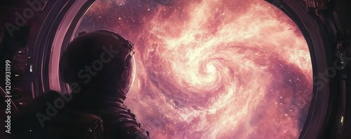 Wall mural a lone astronaut gazing at a swirling nebula from a spaceship window.