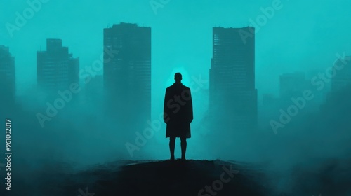 The watermark will not be included on Wall mural.: A lone figure standing in a dark cyberpunk cityscape, illuminated only by the faint glow of distant