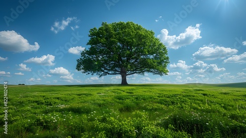 Wall mural a lone tree standing in a field of green grass, with a blue sky and fluffy white clouds in the backg - Wall murals Wall mural a lone tree standing in a field of green grass, with a blue sky and fluffy white clouds in the backg - Wall murals