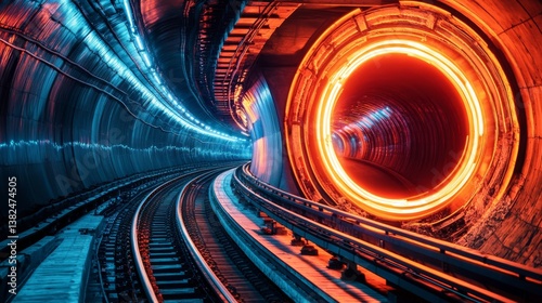 The watermark will not be included on Wall mural.: A long, futuristic subway tunnel with neon lights and train tracks -