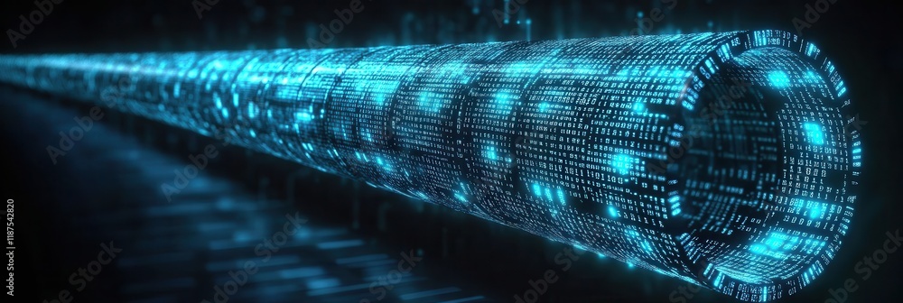 Wall mural a long digital pipeline shaped by vibrant glowing blue matrix binary code. isolated on black backgro