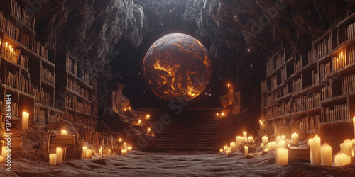 Wall mural a magical 3d background of an ancient library hidden deep within a mountain. floating candles illumi
