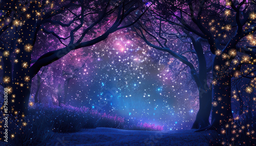 Wall mural a magical forest path illuminated with glowing stars and surrounded by a purple sky, creating a whim