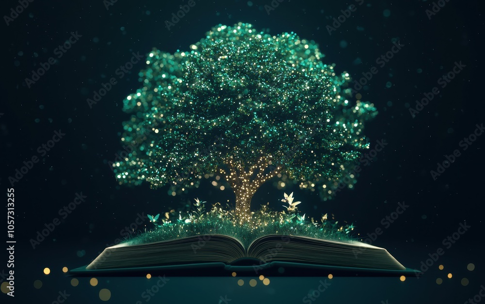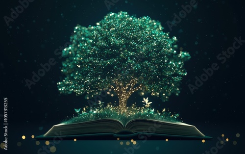 Wall mural a magical glowing tree emerges from an open book, symbolizing the connection between knowledge and n