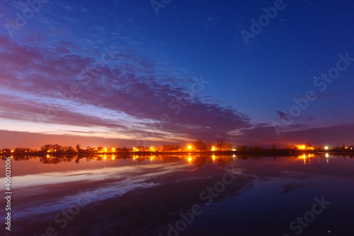 Wall mural a magical starry night on the river bank with a large tree and a milky way in the sky and falling st - Wall murals Wall mural a magical starry night on the river bank with a large tree and a milky way in the sky and falling st - Wall murals