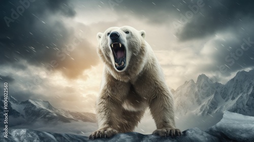 A majestic polar bear roars powerfully, standing on rocky terrain against a dramatic, snowy backdropWall mural