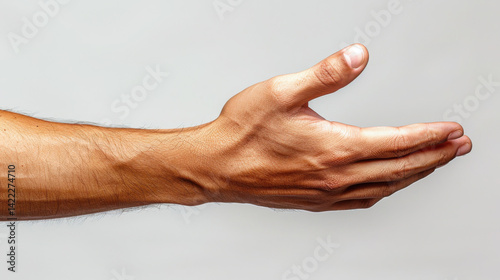 The watermark will not be included on Wall mural.: A male arm highlighting the inner part of the forearm with the hand open, empty white flat backgroun