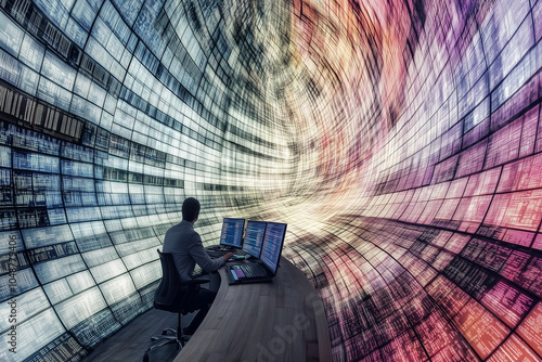 Wall mural a male it professional with their back to the viewer observing the large amount of computer monitors