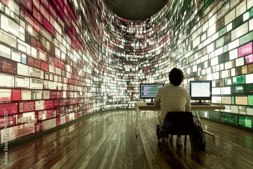 The watermark will not be included on Wall mural.: A male it professional with their back to the viewer observing the large amount of computer monitors