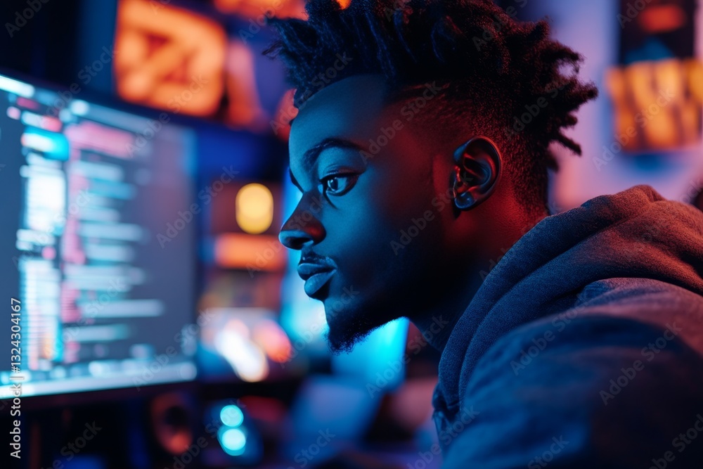 The watermark will not be included on Wall mural.: A man coding on computer in the dark environment -