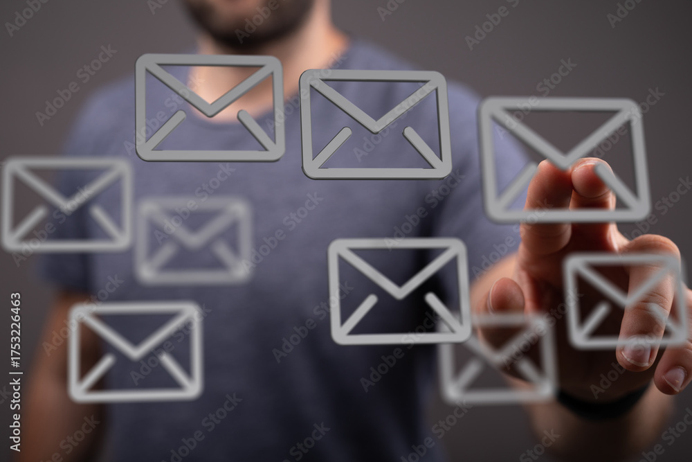 A man interacts with floating email icons, representing digital communication and inbox management - Wall mural