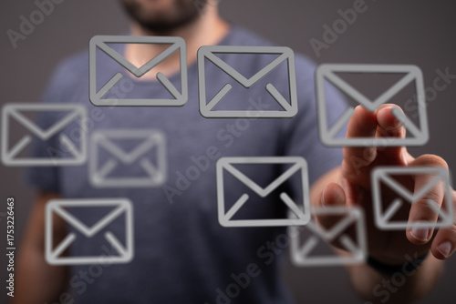 Wall mural : A man interacts with floating email icons, representing digital communication and inbox management -