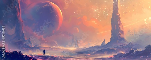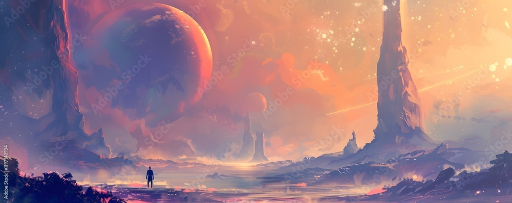 The watermark will not be included on Wall mural.: A man is standing in a field with a planet in the background