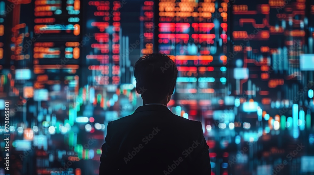 Wall mural a man is standing in front of a computer screen with a city view in the background. the man is weari - Wall murals Wall mural a man is standing in front of a computer screen with a city view in the background. the man is weari - Wall murals