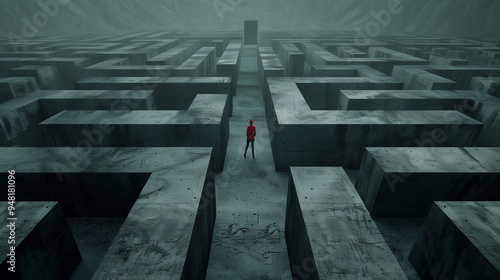 Wall mural a man is walking through a maze with a red line on the ground. the maze is dark and gloomy, and the