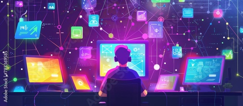 The watermark will not be included on Wall mural.: A man sits at a desk surrounded by various computers and numerous icons on the screens -