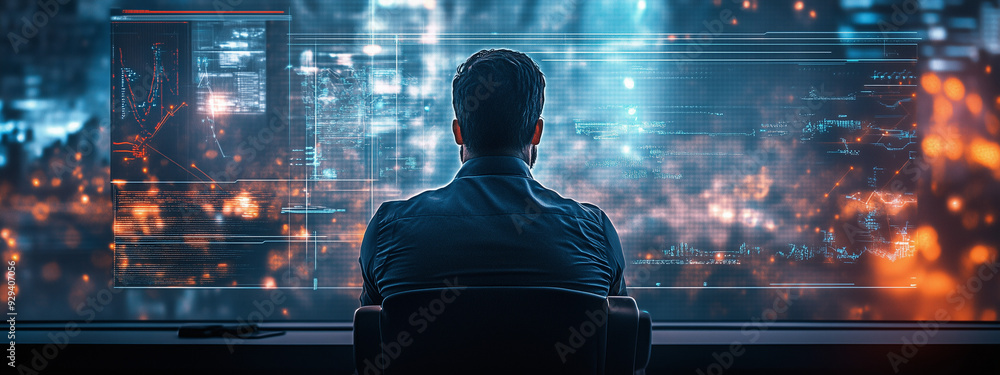 Wall mural a man sits in a dark room facing multiple futuristic digital screens, immersed in data analysis with