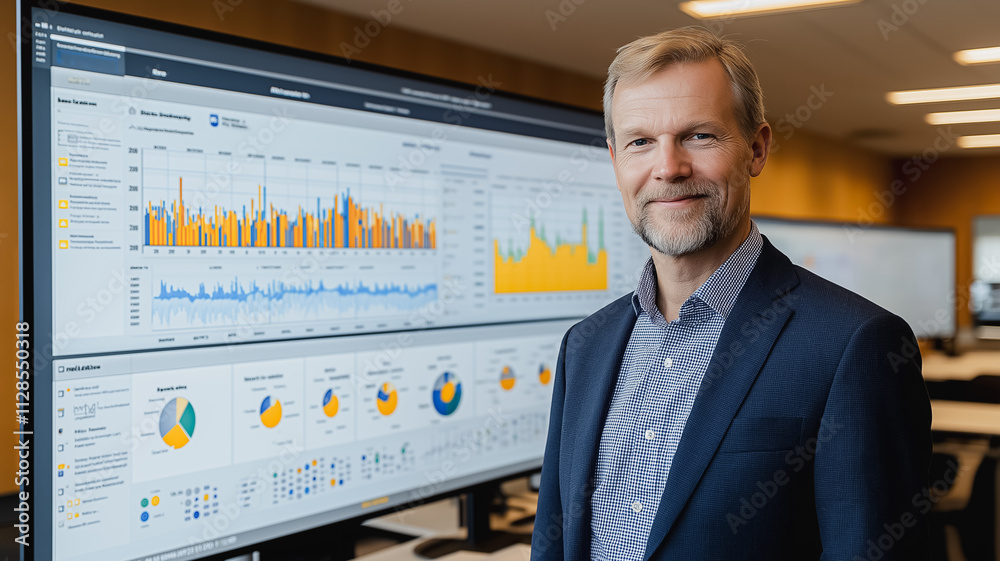 The watermark will not be included on Wall mural.: A man stands in front of a computer monitor displaying a graph - he is wearing a suit and he is smili