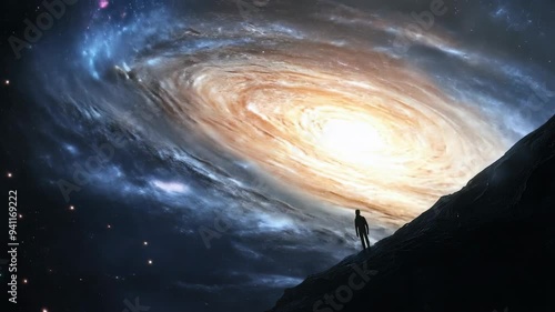 Wall mural a man stands in front of a huge galaxy surrounded by stars and space, creating a feeling of the vast - Wall murals Wall mural a man stands in front of a huge galaxy surrounded by stars and space, creating a feeling of the vast - Wall murals