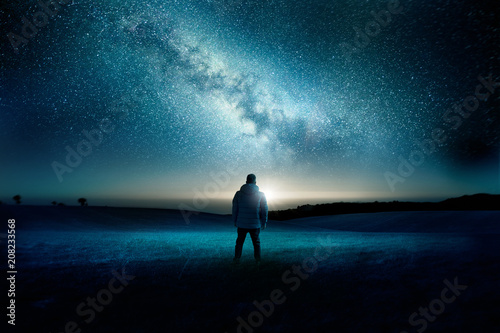 Wall mural : A man stands watching with wonder and amazement as the moon and milky way galaxy fill the night sky -