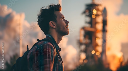 The watermark will not be included on Wall mural.: A man with a backpack looks up in awe at a towering launchpad structure against a sunset sky -