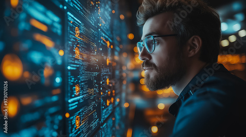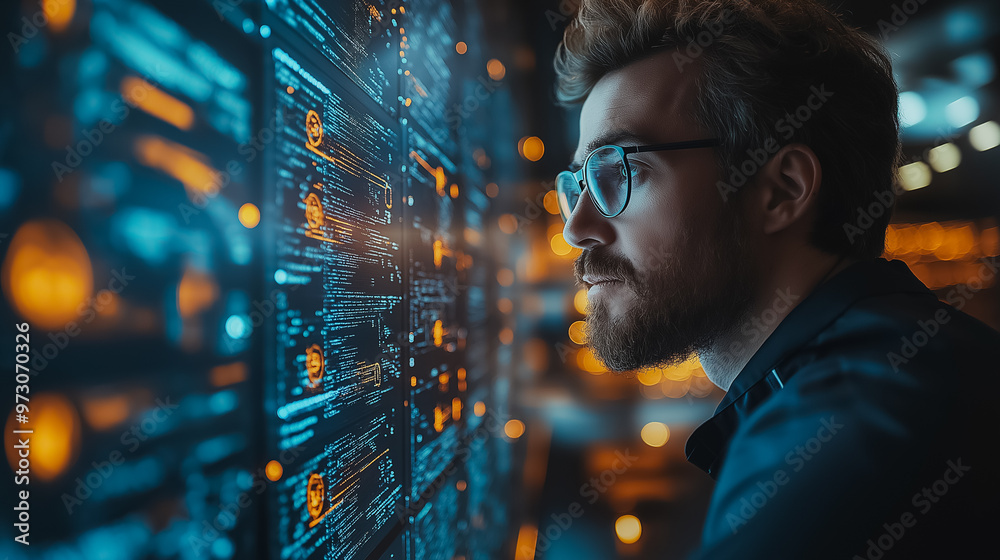 Wall mural a man with glasses is looking at a computer screen with a lot of numbers and symbols. concept of foc