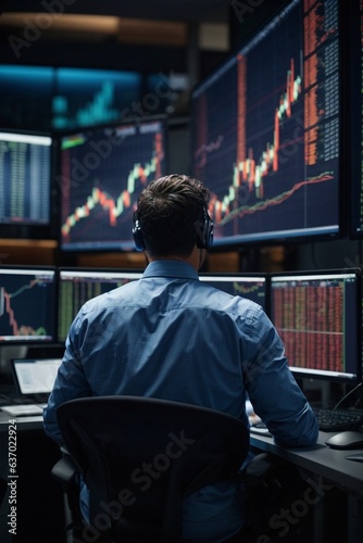 The watermark will not be included on Wall mural.: A man working at a desk with multiple computer monitors