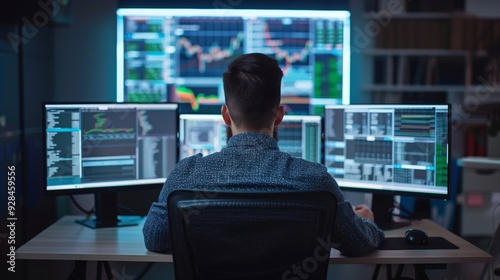 The watermark will not be included on Wall mural.: A man works as an operator specialist in a computer data center in front of many monitors with chart