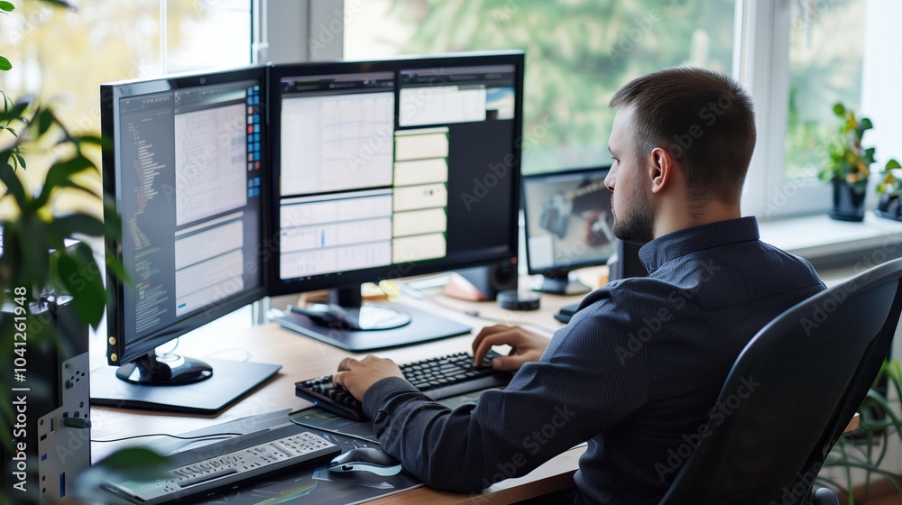 The watermark will not be included on Wall mural.: A man works as an operator specialist in a computer data center in front of many monitors with chart