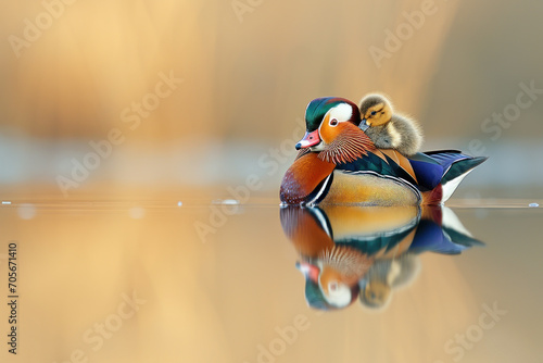 Wall mural : A mandarin duck with her cub, mother love and care in wildlife scene