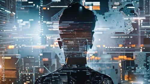 The watermark will not be included on Wall mural.: A mans face close-up in front of a vibrant digital backdrop, visualize the idea of machine learning