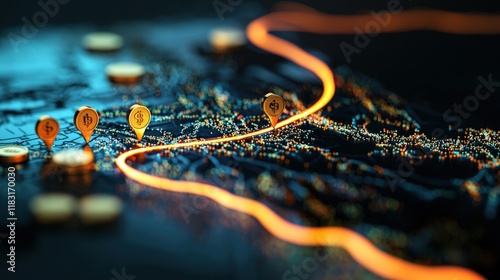 The watermark will not be included on Wall mural.: A map with a line drawn through it and four coins on it