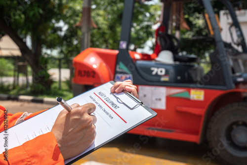 The watermark will not be included on Wall mural.: A mechanical engineer is using heavy equipment checklist form for inspecting the factory forklift ve