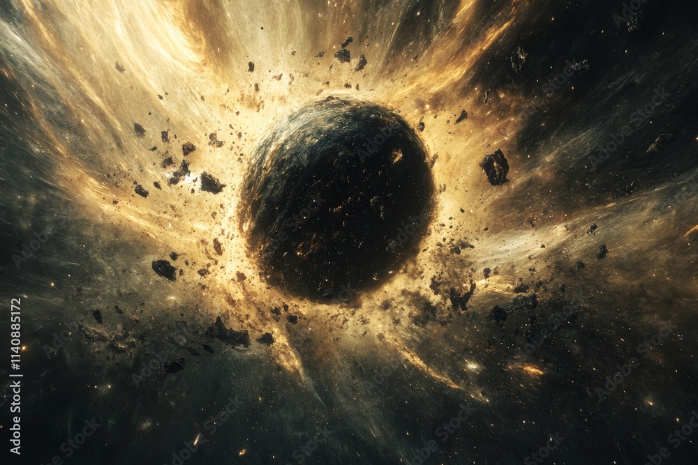 The watermark will not be included on Wall mural.: A mesmerizing cosmic scene showcasing a swirling orb engulfed in a dynamic explosion of material and