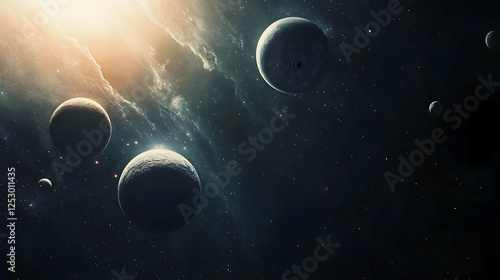 Wall mural a mesmerizing cosmic view showing two planets floating in space with a bright star casting a glow on - Wall murals Wall mural a mesmerizing cosmic view showing two planets floating in space with a bright star casting a glow on - Wall murals