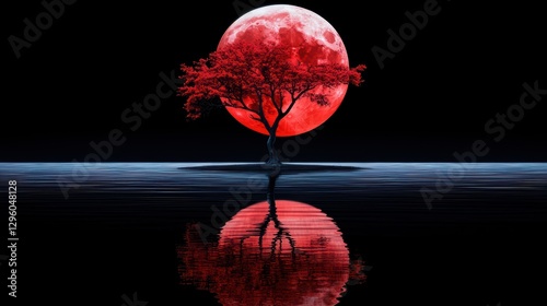 Wall mural a mesmerizing view of a blood moon during a lunar eclipse reflected on the surface of a lake, its re - Wall murals Wall mural a mesmerizing view of a blood moon during a lunar eclipse reflected on the surface of a lake, its re - Wall murals