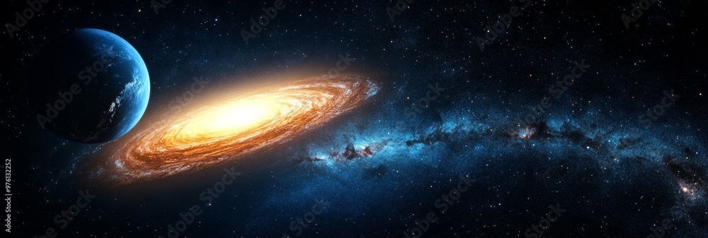 The watermark will not be included on Wall mural.: A mesmerizing view of a spiral galaxy illuminating a distant planet in the vast expanse of deep spac